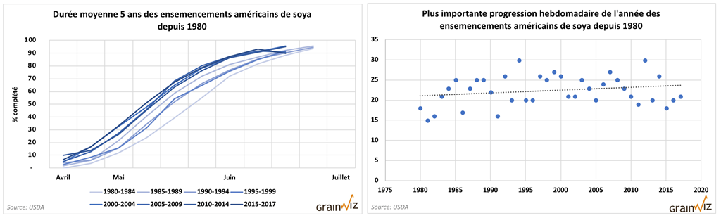 Avec le début de saison tardif aux États-Unis, plusieurs analystes de marché auront rappelé depuis deux semaines qu’avec les technologies d’aujourd’hui et les semoirs à *48 rangs*, il ne suffit en réalité que de quelques jours de beau temps pour rattraper le temps perdu. Difficile d’argumenter avec cette idée, puisqu’il est vrai que les producteurs possèdent de nos jours des équipements certainement plus performants qu’il y a une trentaine d’années.