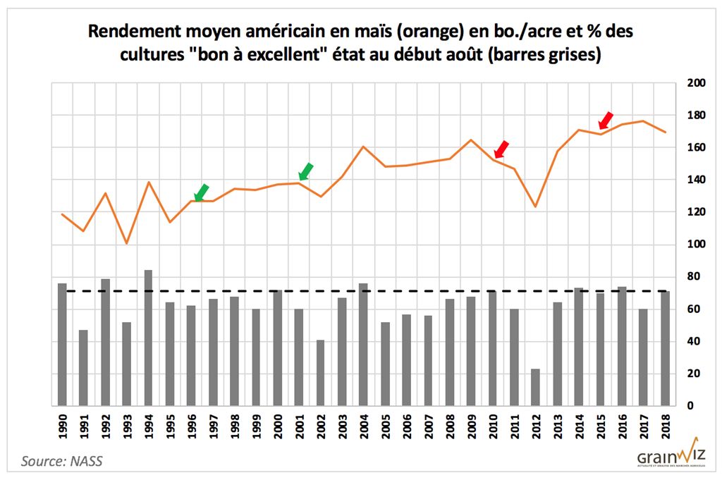 Depuis le début de la saison 2018, aux États-Unis, les marchés ont fait grand cas des conditions remarquables des cultures de maïs semaine après semaine. Pour débuter le mois d’août, 71% des cultures de maïs américain étaient jugés dans un état de « bon à excellent ». Question de remettre les choses en perspective, la moyenne des dernières années est plutôt de 63% au début août. Donc en effet, déjà ici, on comprend que 2018 semble une très bonne année pour les producteurs américains.