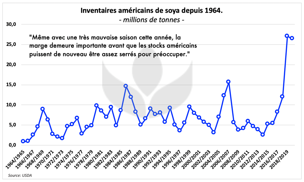 La dernière fois que ce fût le cas remonte bien évidemment à la fameuse sécheresse de 2012, année où la récolte américaine de soya qui était prévu au printemps à 87,23 millions de tonnes est passée à seulement 82,06 millions de tonnes à l’automne suivant. On parle donc essentiellement d’une réduction de 5 millions de tonnes. Si c’était le cas cette année, nous passerions de 27 à autour de 22 millions de tonnes. Historiquement, ce niveau des stocks américains resterait le 3e plus élevé jamais enregistré. Difficile de dire ensuite qu’il y a vraiment matière à s’inquiéter. Même avec une très mauvaise saison cette année, la marge demeure importante avant que les stocks américains puissent de nouveau être assez serrés pour préoccuper.