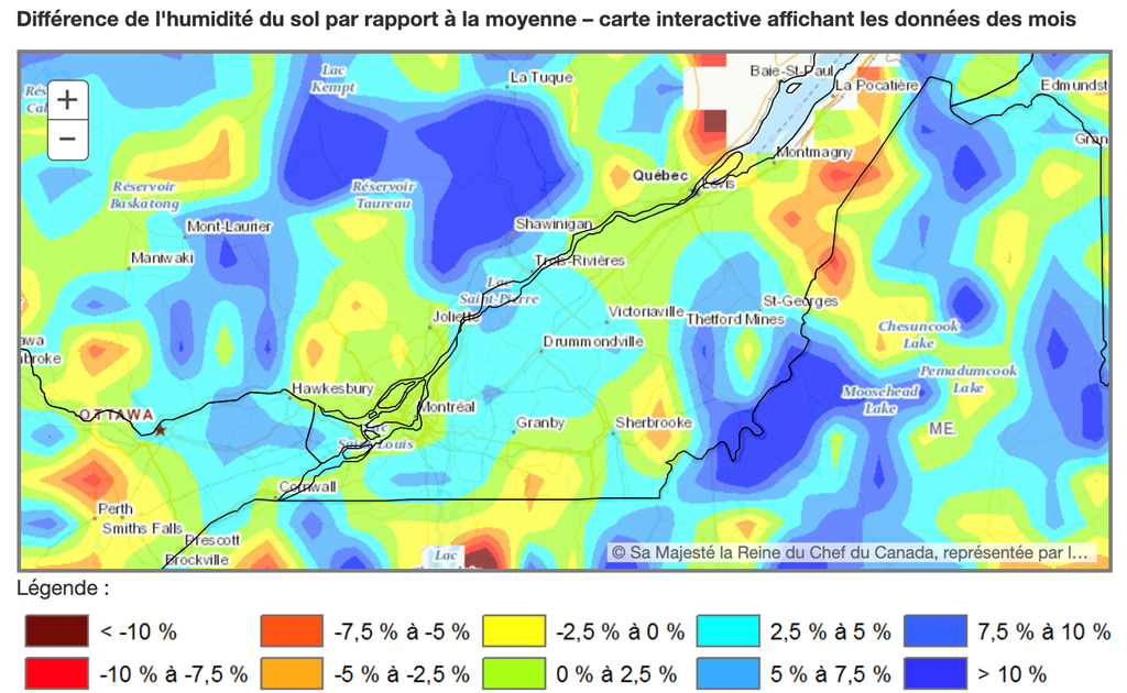 Au Québec, l’humidité du sol par rapport à la normale est très variable selon les régions.