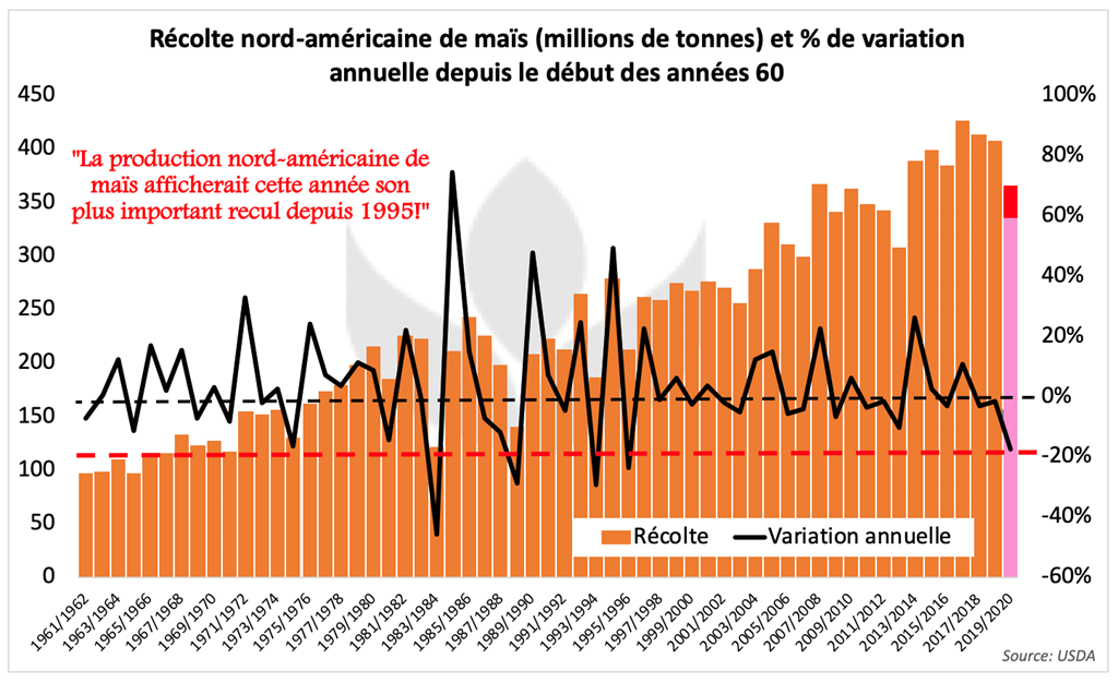 Si finalement, on additionne États-Unis, Ontario et Québec, on peut prévoir essentiellement une baisse annuelle de production de maïs nord-américain d’au moins 40 à plus de 71 millions de tonnes. Historiquement, une baisse aussi importante de l’ordre de 9 à 17% n’a pas été observée depuis évidemment 2012, avec 10% de recul. Il faut ensuite remonter à 1995, avec une forte baisse de 24%.