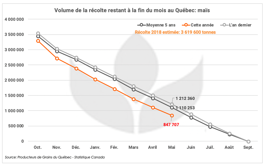 Pour le maïs, dès la dernière récolte, l’écoulement aura été plus important qu’à la normale dans les dernières années. D’octobre à décembre dernier, on parle d’autour de 100 000 tonnes de plus qu’à la normale par mois, creusant dès la fin de 2018 un écart de 300 000 à 350 000 tonnes. Le rythme aura ralenti par la suite, mais sera demeuré plus élevé que l’an dernier jusqu’en avril. Sachant que la récolte de maïs de l’an dernier a affiché un recul de 4% à 3,62 millions de tonnes, la moins importante depuis 2014, on comprend qu’il y a certainement déjà moins de maïs qu’à la normale pour se rendre aux récoltes.