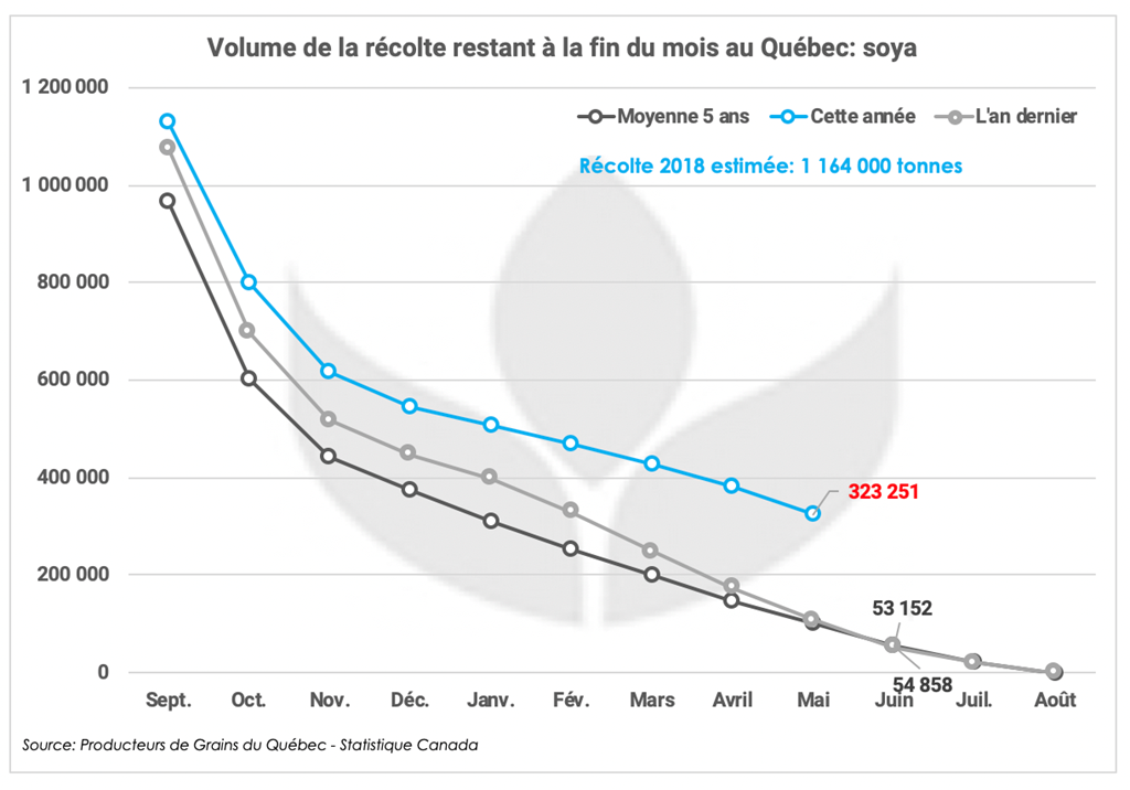 Selon les données disponibles, il restait à la fin mai une quantité impressionnante de soya dans les silos québécois, plus de 300 000 tonnes contre normalement de 50 000 à 55 000 tonnes.