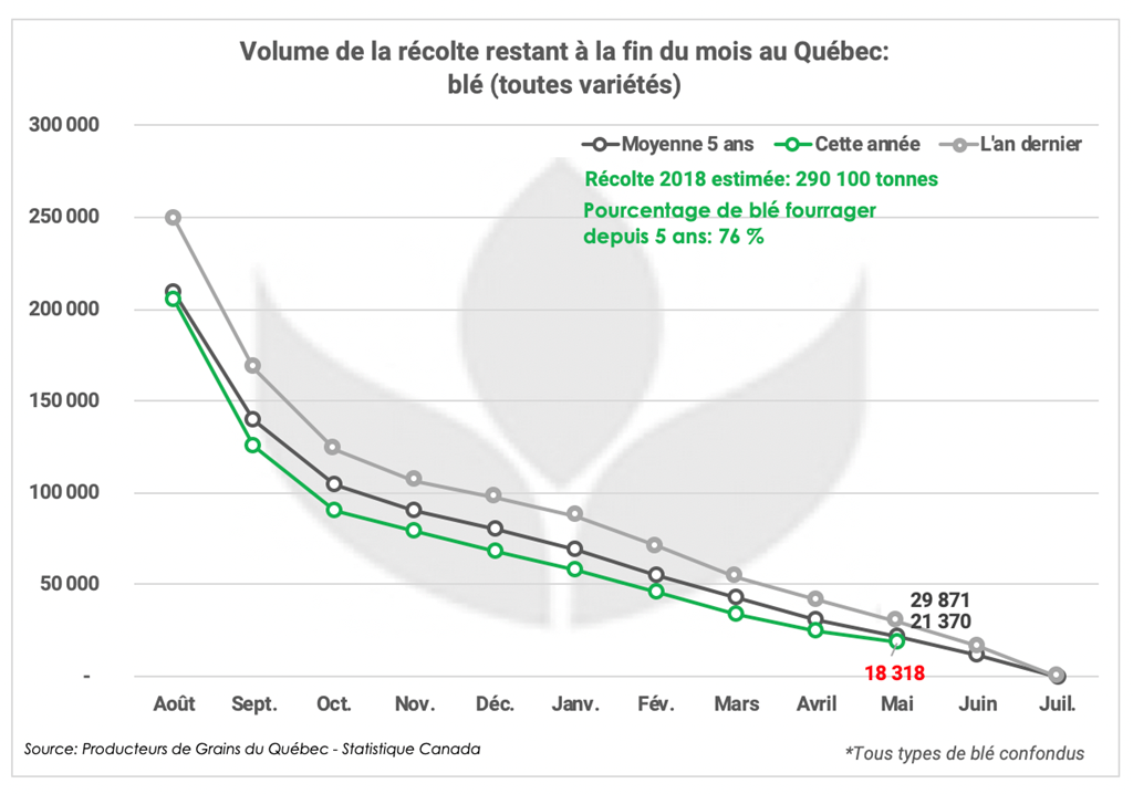 Enfin pour le blé, avec la récolte qui approche à grands pas, on peut évaluer qu’il restait à la fin mai autour de 18 318 tonnes. C’est peu par comparaison à la moyenne de 21 000 tonnes à la fin mai depuis 5 ans, et de près de 30 000 tonnes l’an dernier.