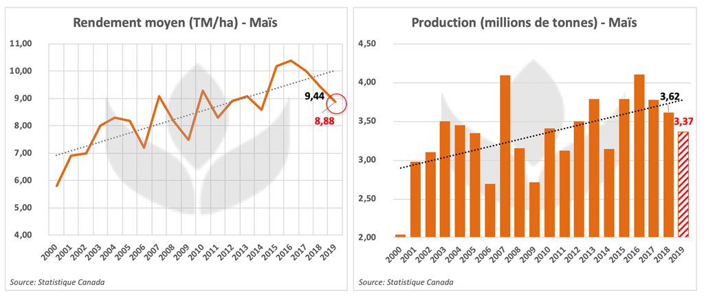 Au net, la récolte québécoise de maïs 2019 passe donc à un creux de 3,37 millions de tonnes contre 3,62 millions de tonnes l’an dernier. Ce résultat est par contre mieux qu’en 2014 avec seulement 3,15 millions de tonnes. Avec l’automne et la pénible récolte de 2019, mais aussi le poids beaucoup plus léger du maïs récolté, il apparait difficile de croire qu’on puisse vraiment faire mieux qu’en 2014. Parions plutôt que Statistique Canada se garde une réserve, et que la récolte devrait encore être réduite dans l’un de ses prochains rapports.