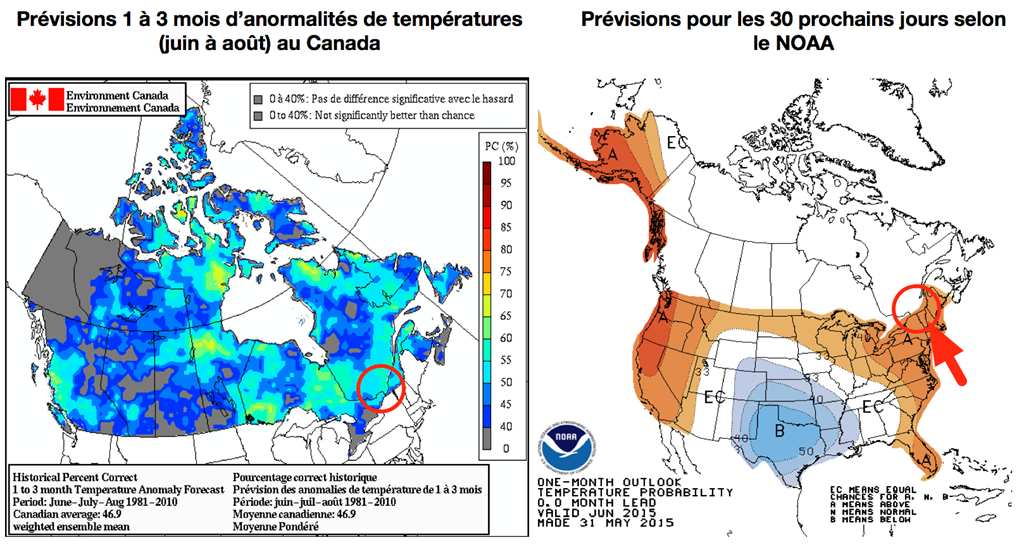 Selon les prévisions 1 à 3 mois (juin à août) d’Environnement Canada, les températures devraient tôt ou tard gagner quelques degrés et passer au-dessus de la normale. Les dernières prévisions laissent d’ailleurs timidement poindre à l’horizon du temps plus chaud d’ici une à deux semaines.