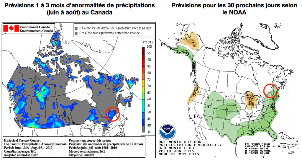 Par contre, malheureusement, les averses ne lâcheront pas prise pour autant. Environnement Canada propose en effet de 40-55 % de probabilité de plus de précipitations qu’à la normale. Cette prévision étant toutefois basée aussi sur un horizon de 1 à 3 mois (juin à août), il reste toujours possible qu’une bonne proportion des averses ait eu lieu en juin, avec du temps plus sec pour prendre les devants progressivement à partir de juillet.