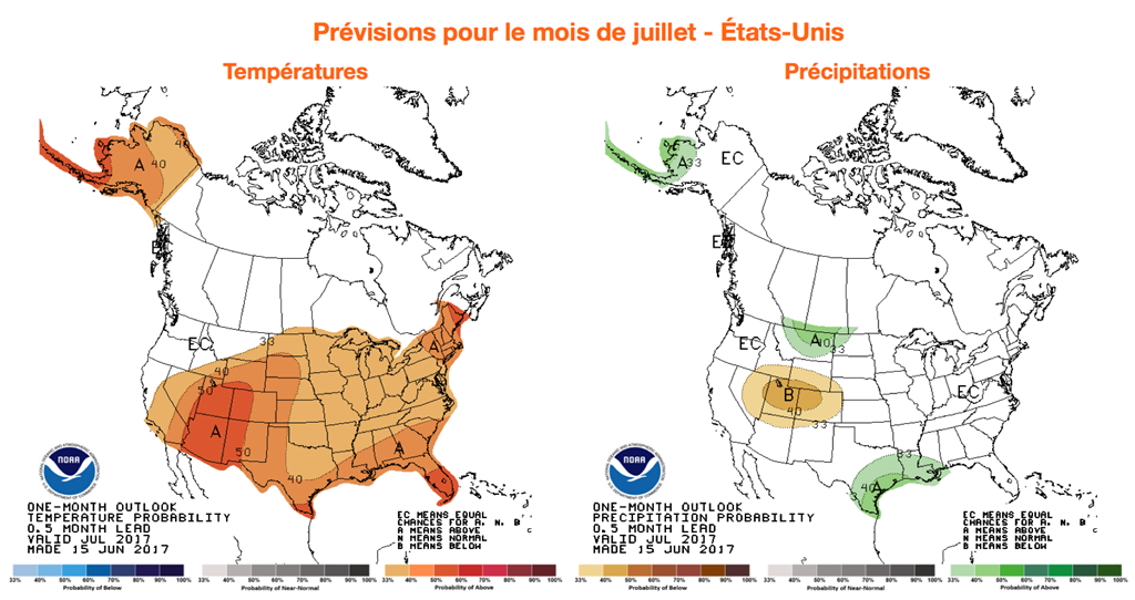 Selon la dernière mise à jour du National Oceanic and Atmospheric Administration (NOAA) aux États-Unis, il faut s’attendre à un mois de juillet et même une fin de saison aux États-Unis plus chaude qu’à la normale. Il n’est donc certainement pas impossible qu’au mois de juillet, les marchés s’emballent de nouveau pendant la pollinisation. Les bases au Québec pour livraison immédiate ayant pour habitude de s’apprécier au cours de l’été et en fin de saison, le prix du maïs pourrait alors profiter de cette opportunité pour grimper de nouveau. Le facteur clé à surveiller dans les prochaines semaines restera donc la météo américaine pour ceux qui souhaitent conclure leurs ventes de maïs d’ici l’automne.