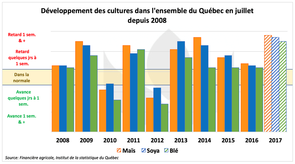 En réalité, pour un mois de juillet, elles n’ont jamais été aussi en retard dans leur développement depuis le début des données de la Financière Agricole disponibles sur le site de l’Institut de la statistique du Québec, 2008. Ce n’est pas rien.