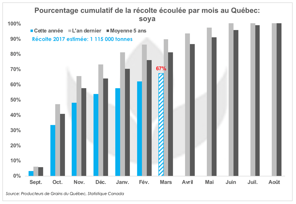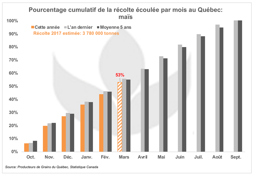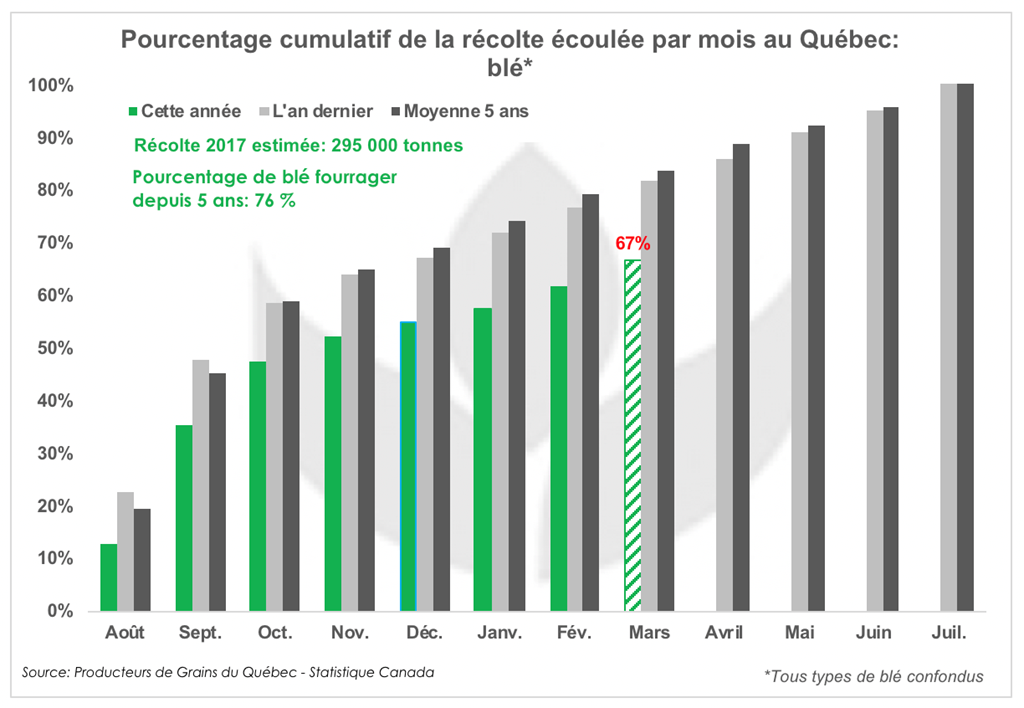 ** Les données présentées par Producteurs de Grains du Québec ne sont pas encore disponibles pour le mois de mars. Les estimations utilisées dans cette analyse tiennent compte de l’écoulement normal des stocks depuis 5 ans pour le mois de mars.