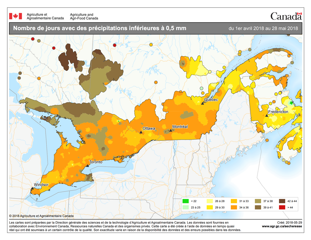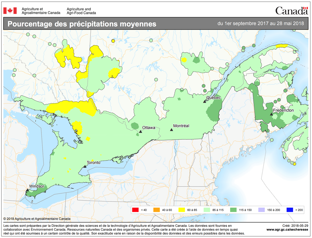 Ce qui est à surveiller maintenant, ce sont les conditions qui commencent à se révéler un peu trop sèches dans certaines régions, spécialement en Montérégie. Jusqu’ici, les données d’Environnement Canada corroborent des précipitations dans la moyenne des dernières années. Par contre, le nombre de jours sans précipitation importante s’étire de plus en plus.