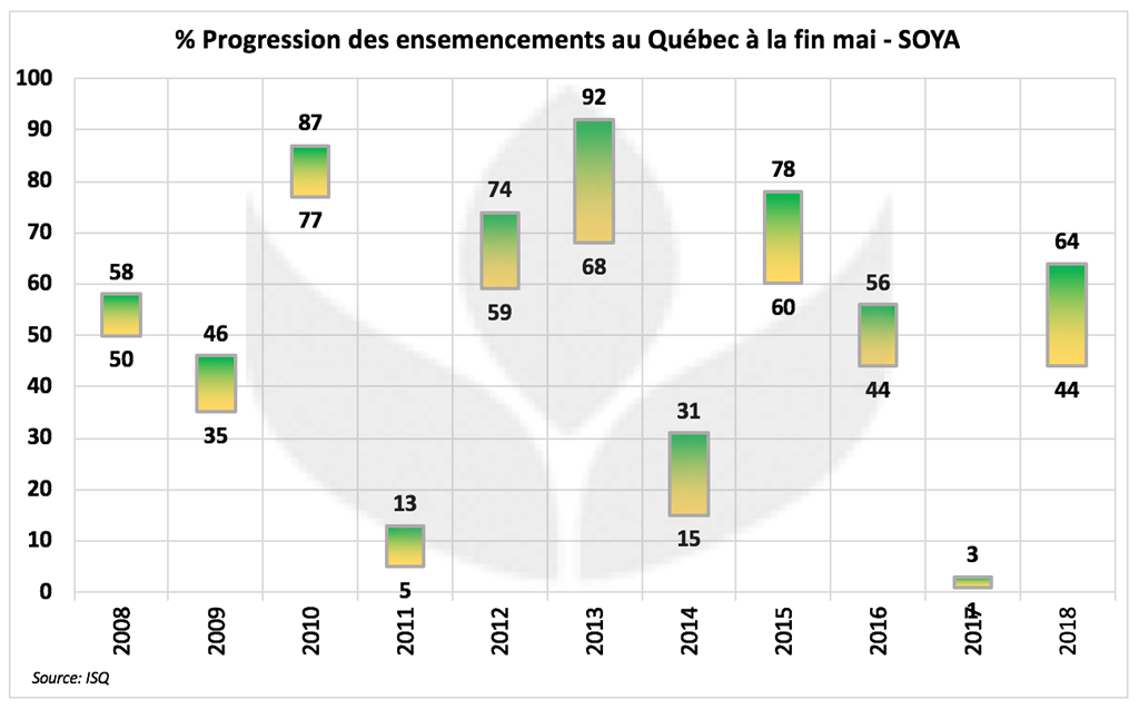 Même son de cloche dans le soya, avec des ensemencements dans la moyenne des 10 dernières années à 44 à 64% de complétés le mardi 22 mai dernier.