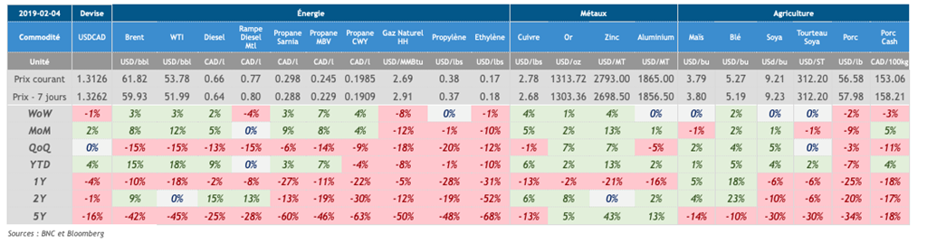 - Des conseillers économiques américains ont mentionné que les discussions entre les représentants chinois et américains furent très satisfaisantes et la "vibe" était bonne (Kudlow). Le marché espère donc des importations de la part de la Chine après les célébrations du Nouvel An chinois cette semaine.