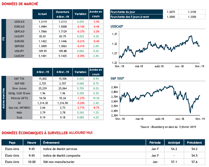 Malgré la Fed et les résultats financiers des entreprises au-delà des attentes, la prudence reste de mise alors que l’attention des investisseurs se tournera rapidement vers les négociations entre les États-Unis et la Chine. La possibilité que le gouvernement américain soit fermé à nouveau dès le 15 février prochain représente aussi un risque. Nous surveillerons ce matin à 10h l’ISM manufacturier aux États-Unis ainsi que le discours sur l’état de l'Union aux États-Unis.