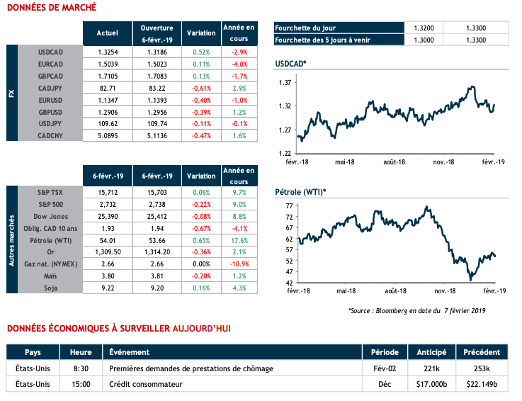 Suite à une excellente performance boursière en début d’année, l’indice VIX qui mesure la volatilité implicite sur le marché des actions se situe à son plus bas niveau en près de quatre mois. Compte tenu de la relation inverse entre les bourses et le VIX, des prises de profits sont peut-être à prévoir au cours des prochaines semaines. Au moment d’écrire ces lignes, les cours pétroliers, les bourses et le dollar canadien enregistrent des pertes. Possiblement une belle opportunité pour les vendeurs de USD de laisser des ordres auprès de notre équipe.
