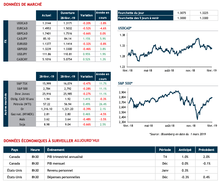 Que nous réserve 2019? Selon nos économistes, notamment à cause des stimuli gouvernementaux qui devraient être moins importants, les États-Unis peineront à afficher une performance économique similaire (prévision de 2.3%). Soulignons aussi que plusieurs indices sous-entendent que les États-Unis se situent dans la phase « mature » du cycle économique, où la croissance est typiquement moins élevée. Dans ce contexte, la Réserve fédérale pourrait avoir le luxe de se montrer patiente. Cela pourrait être propice à un dollar américain plus faible.