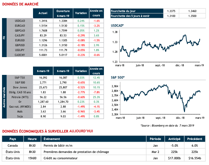 La banque centrale a reconnu la nécessité d’afficher davantage de patience dans son parcours de resserrement de politique monétaire, ce qui cadre avec les anticipations du marché. Bref, le huard a perdu près d’un sous contre le billet vert et l’euro dans les instants suivants l’annonce.