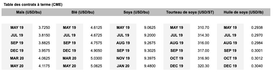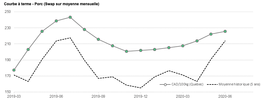 - Les premiers mois de la courbe à terme commencent à être très attrayant par rapport au prix au comptant. Le contrat du mois d’avril 2019 se transige présentement avec une prime de plus de 50 CAD/100kg à moins de 1 mois de l’échéance du contrat. Considérant que le prix au comptant d’avril est généralement inférieur à celui de mars, le portrait est intéressant pour les vendeurs.