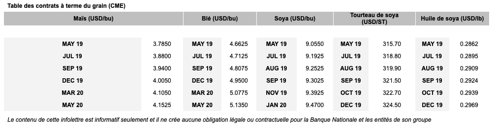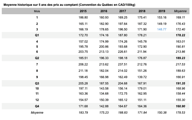 Voici les prix les plus récents sur le marché du porc et des grains: