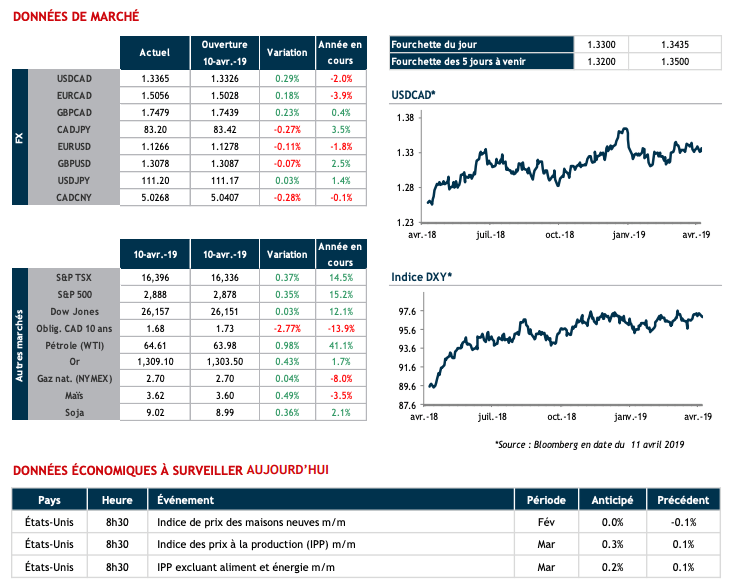Niveau économique, les banques centrales ont volé la vedette. En Europe, la Banque centrale européenne (BCE) a pris soin de réitérer son biais pour la prudence (risques Brexit, croissance internationale, etc.). Le président de la BCE a souligné que sa lecture des perspectives économiques européennes n’a pas changé depuis la dernière rencontre, ce qui a redonné de la vigueur à l’EUR. Aussi, durant la nuit, les pays membres de la Zone euro ont accordé au Royaume-Uni un délai jusqu’au 31 octobre pour le Brexit. La livre sterling réagit très peu.