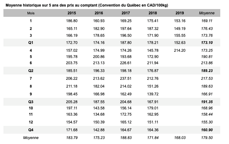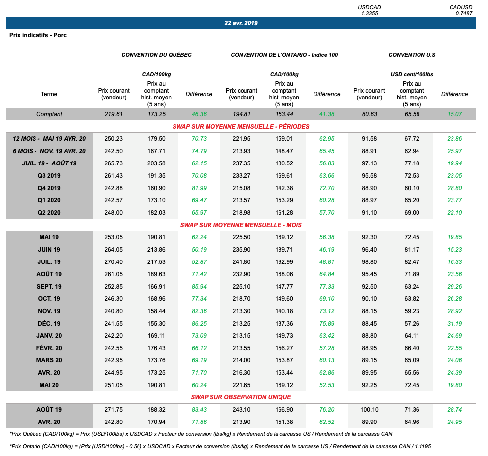 Voici les prix les plus récents sur le marché du porc et des grains: