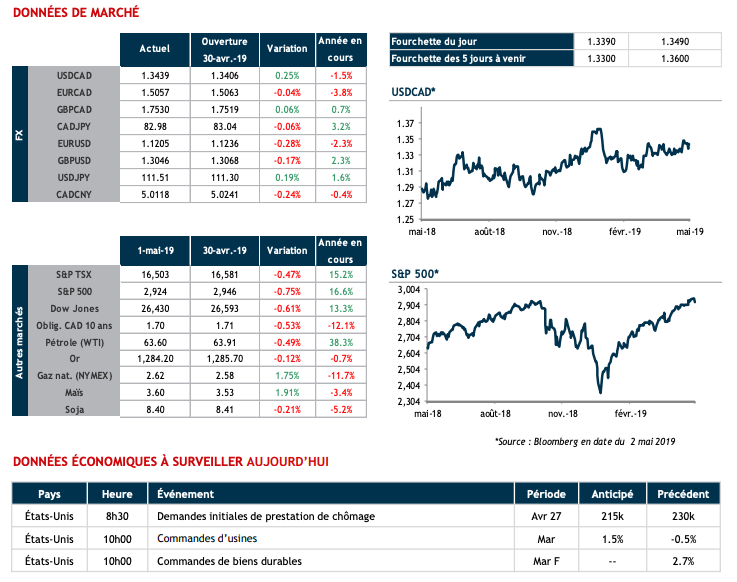 Dans l’attente des données d’emplois demain, nous surveillons ce matin les commandes manufacturières et de biens durables à 10h aux États-Unis. Le restant de la semaine s’annonce encore mouvementé et les entreprises qui exportent aux États-Unis devraient profiter du contexte actuel pour laisser des ordres de vente auprès de notre équipe.