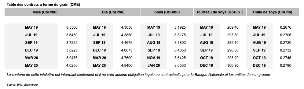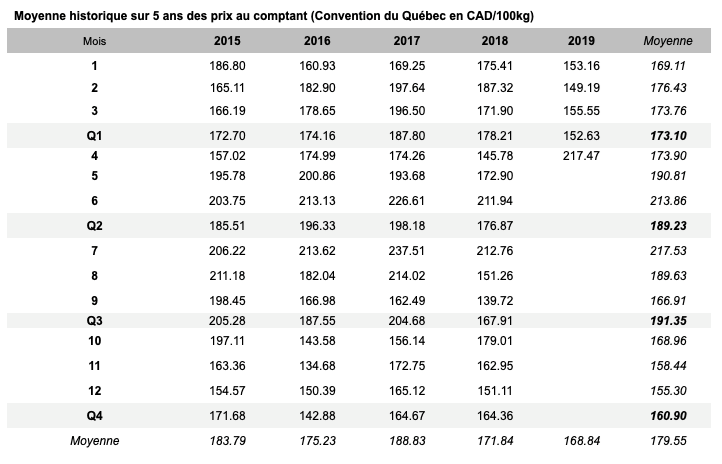 Voici les prix les plus récents sur le marché du porc et des grains: