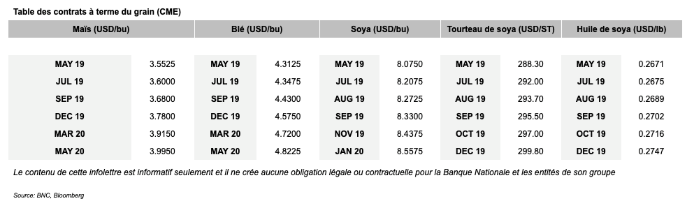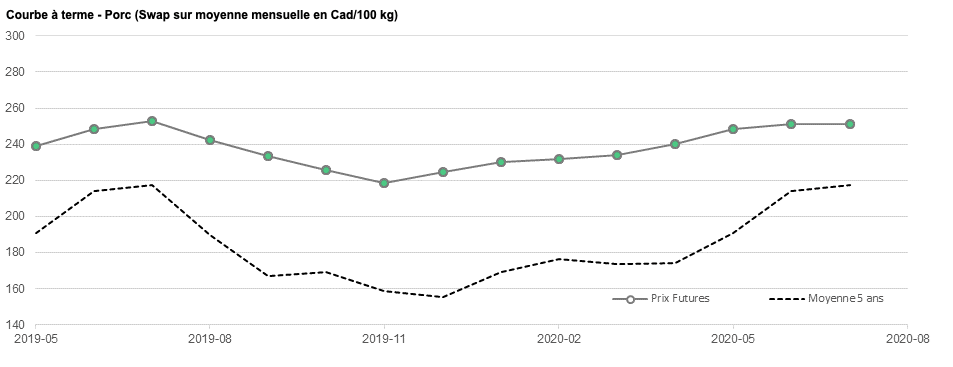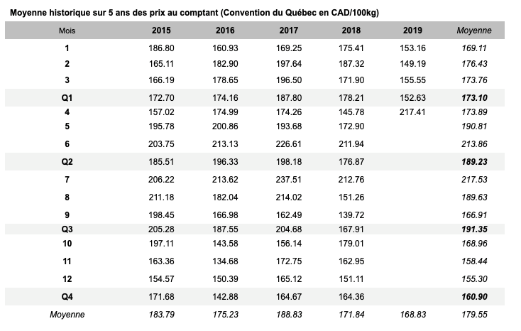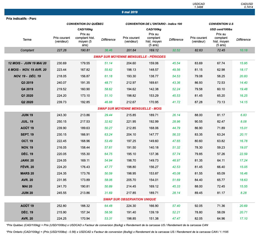 Voici les prix les plus récents sur le marché du porc et des grains:
