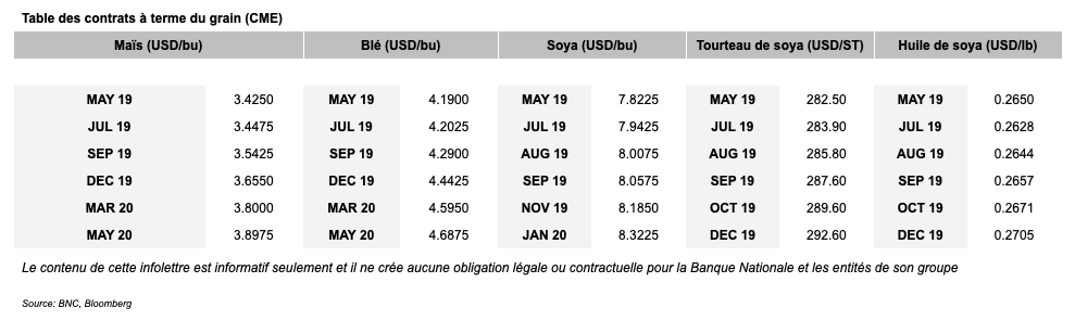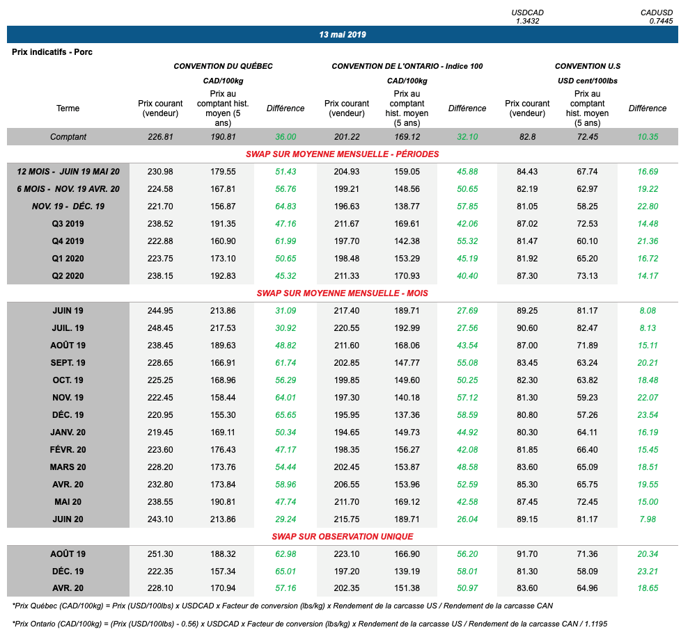 Voici les prix les plus récents sur le marché du porc et des grains: