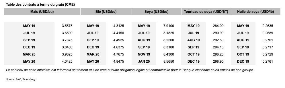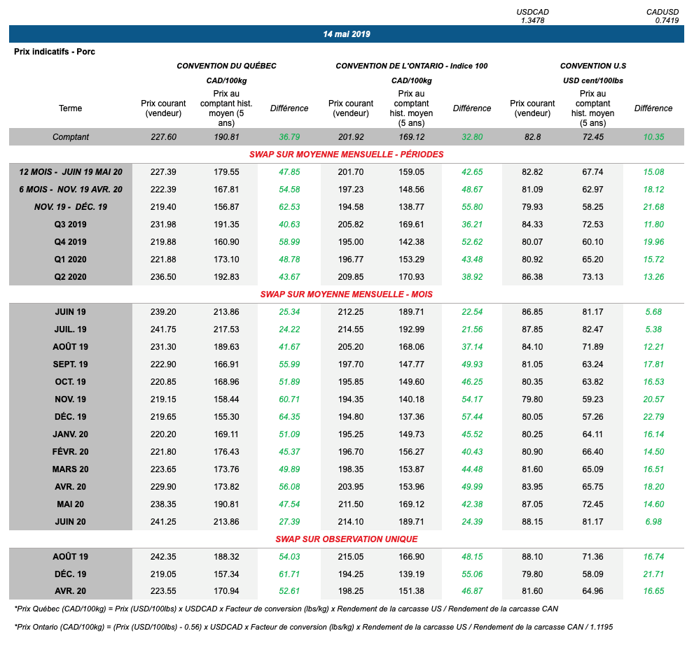 Voici les prix les plus récents sur le marché du porc et des grains:
