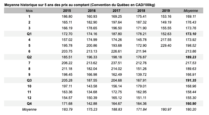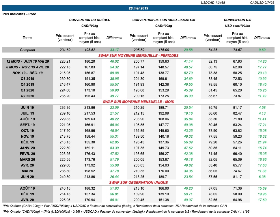 Voici les prix les plus récents sur le marché du porc et des grains: