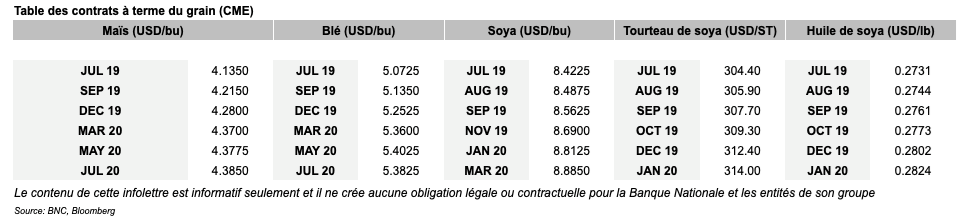 - Les contrats actifs de maïs sont au plus haut niveau en près de trois ans. Les inondations aux États-Unis affectent les activités agricoles chez le plus gros producteur de maïs au monde. Les contrats de blé et de soya sont aussi en hausse.
