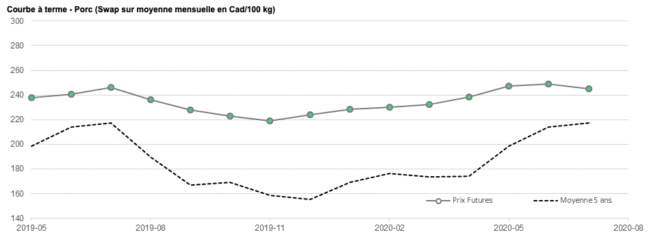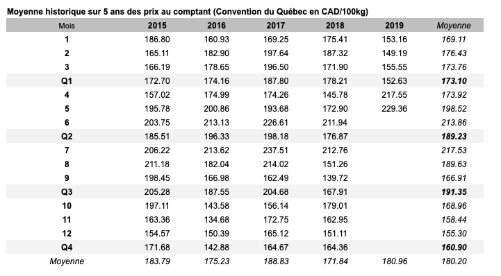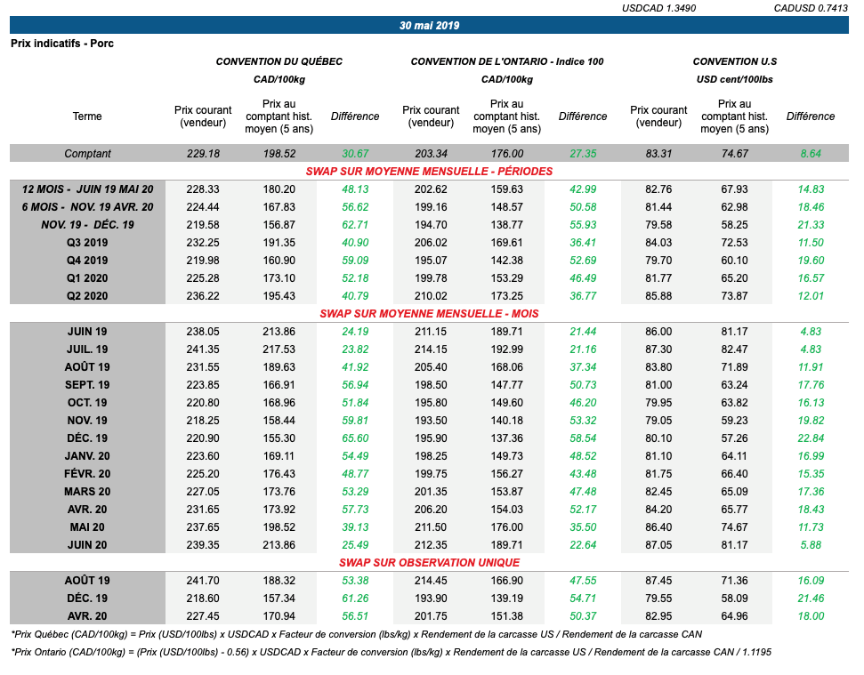 Voici les prix les plus récents sur le marché du porc et des grains: