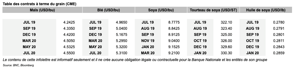 - Les acheteurs de grains chinois détenus par l’État ont suspendu leurs achats de grains américains dans la foulée de la guerre commerciale sino-américaine.