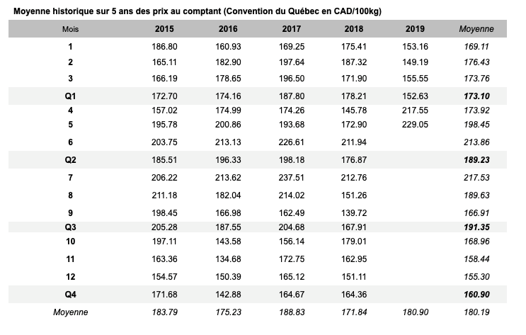 Voici les prix les plus récents sur le marché du porc et des grains: