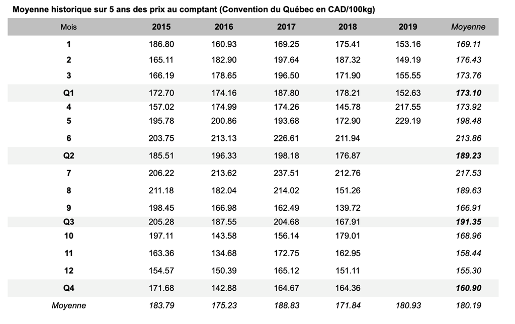 Voici les prix les plus récents sur le marché du porc et des grains: