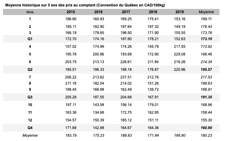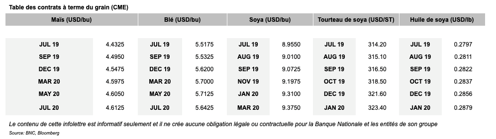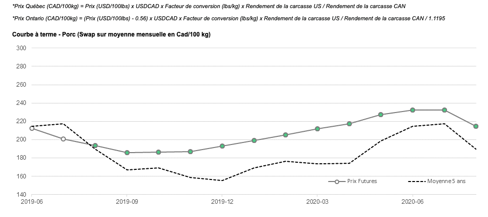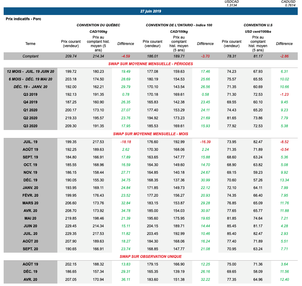 Voici les prix les plus récents sur le marché du porc et des grains: