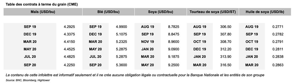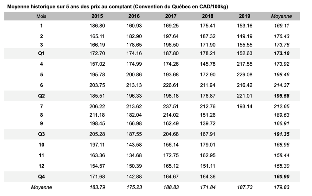 Voici les prix les plus récents sur le marché du porc et des grains: