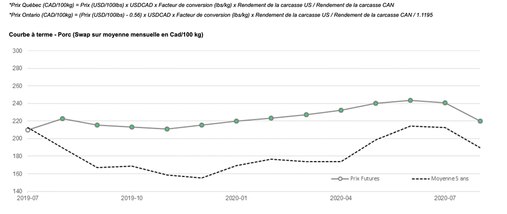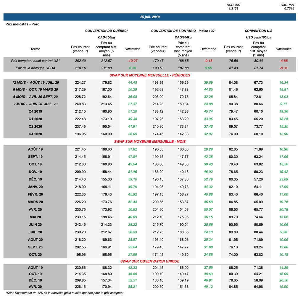 • Les contrats de porc ont subi des sorts variés hier, enregistrant tous des gains sauf pour les contrats d’octobre et décembre 2019, ainsi que ceux de février et d’octobre 2020.