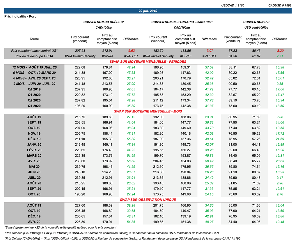 Voici les prix les plus récents sur le marché du porc et des grains: