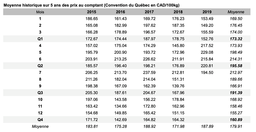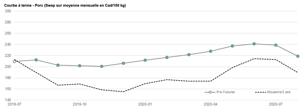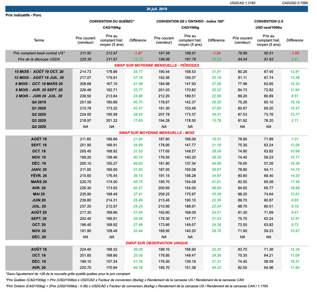 Voici les prix les plus récents sur le marché du porc et des grains: