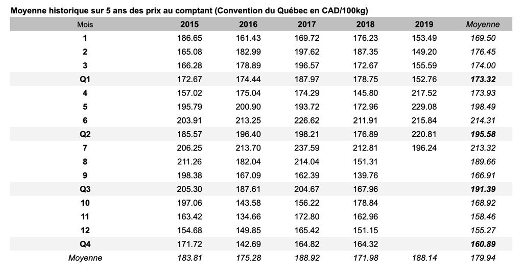 Voici les prix les plus récents sur le marché du porc et des grains: