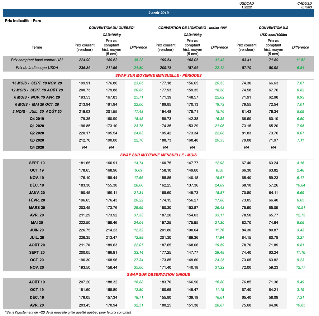 Voici les prix les plus récents sur le marché du porc et des grains: