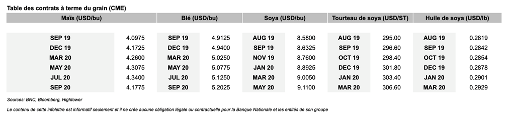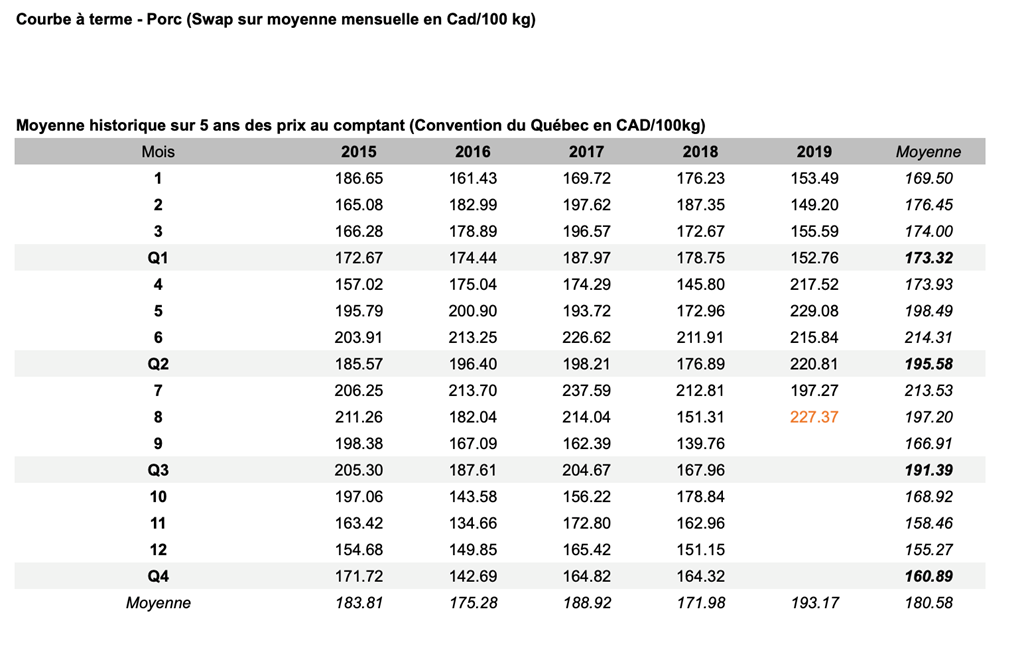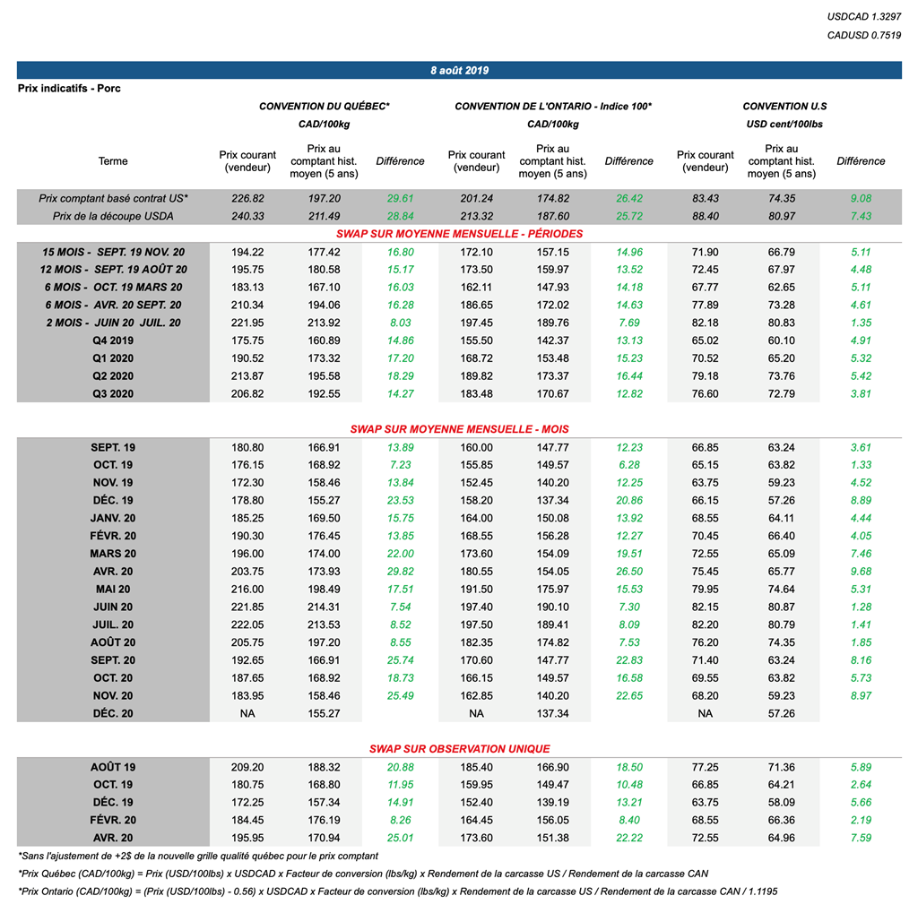 Voici les prix les plus récents sur le marché du porc et des grains: