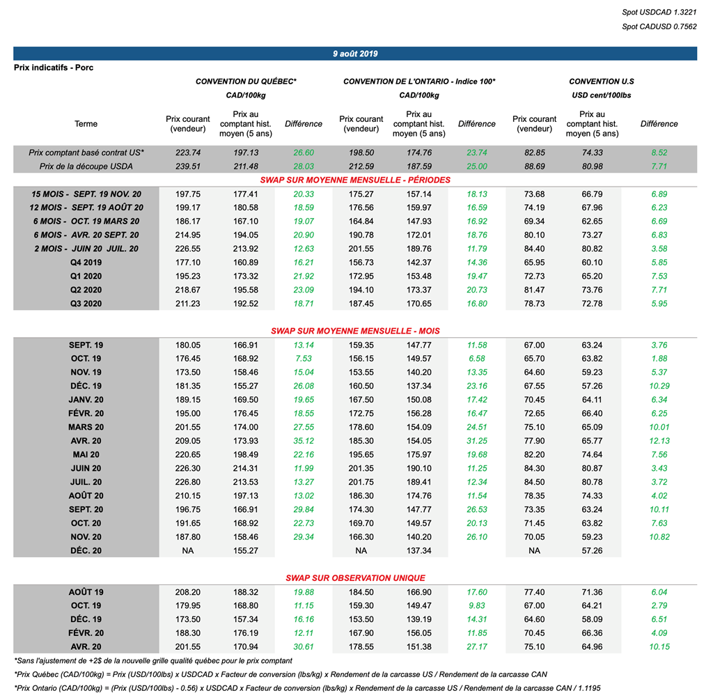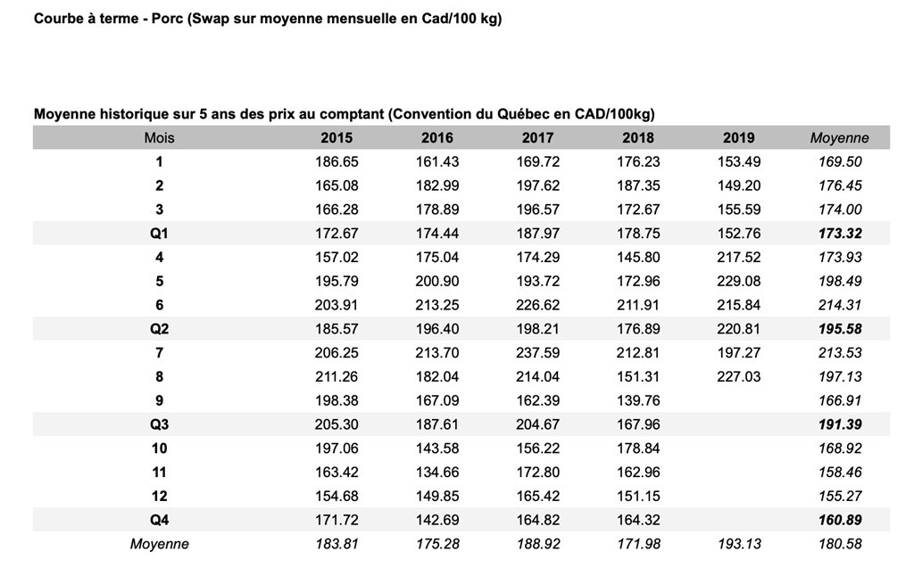Voici les prix les plus récents sur le marché du porc et des grains: