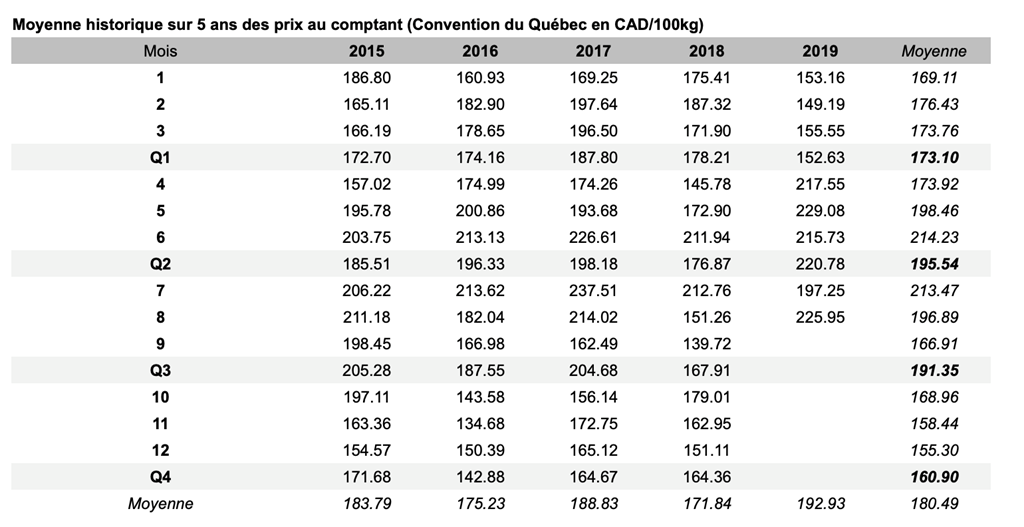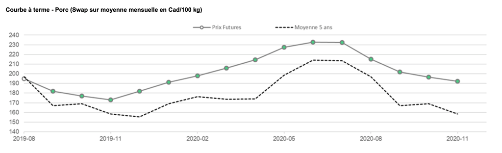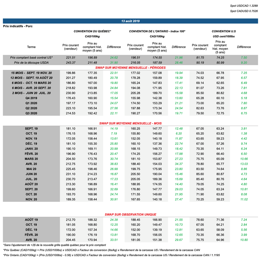 Voici les prix les plus récents sur le marché du porc et des grains:
