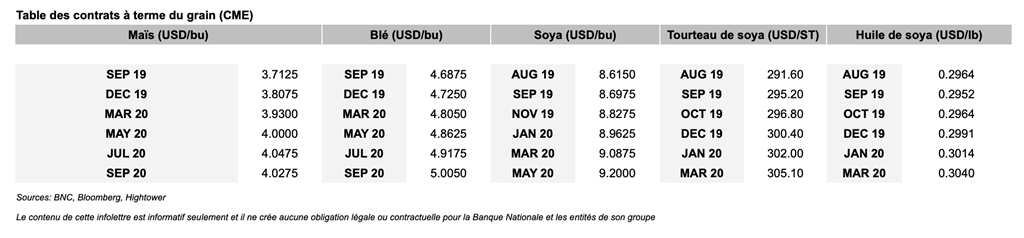 • Le USDA a aussi revu ses estimations d’exportations pour le soya à la baisse, en raison des tensions commerciales sino-américaines et de la PPA qui ravage la population porcine chinoise.