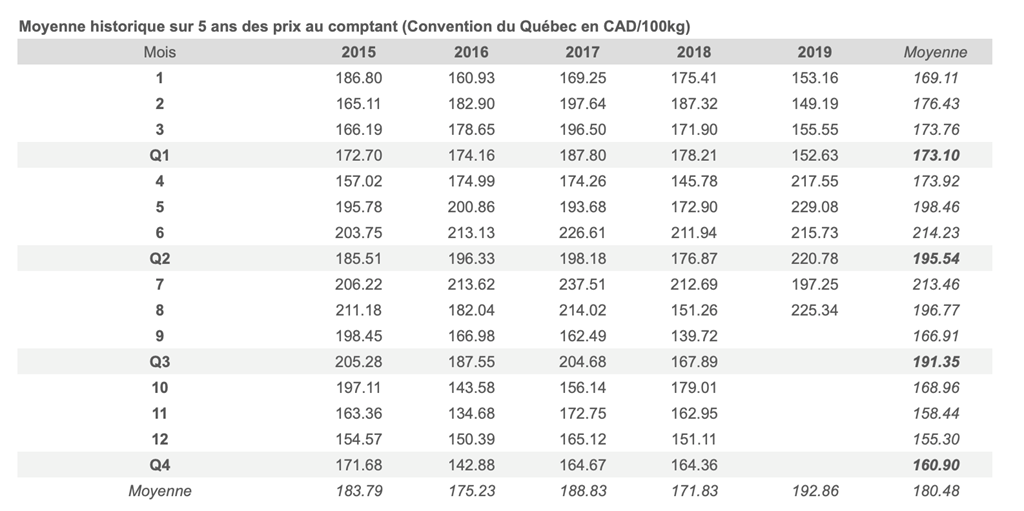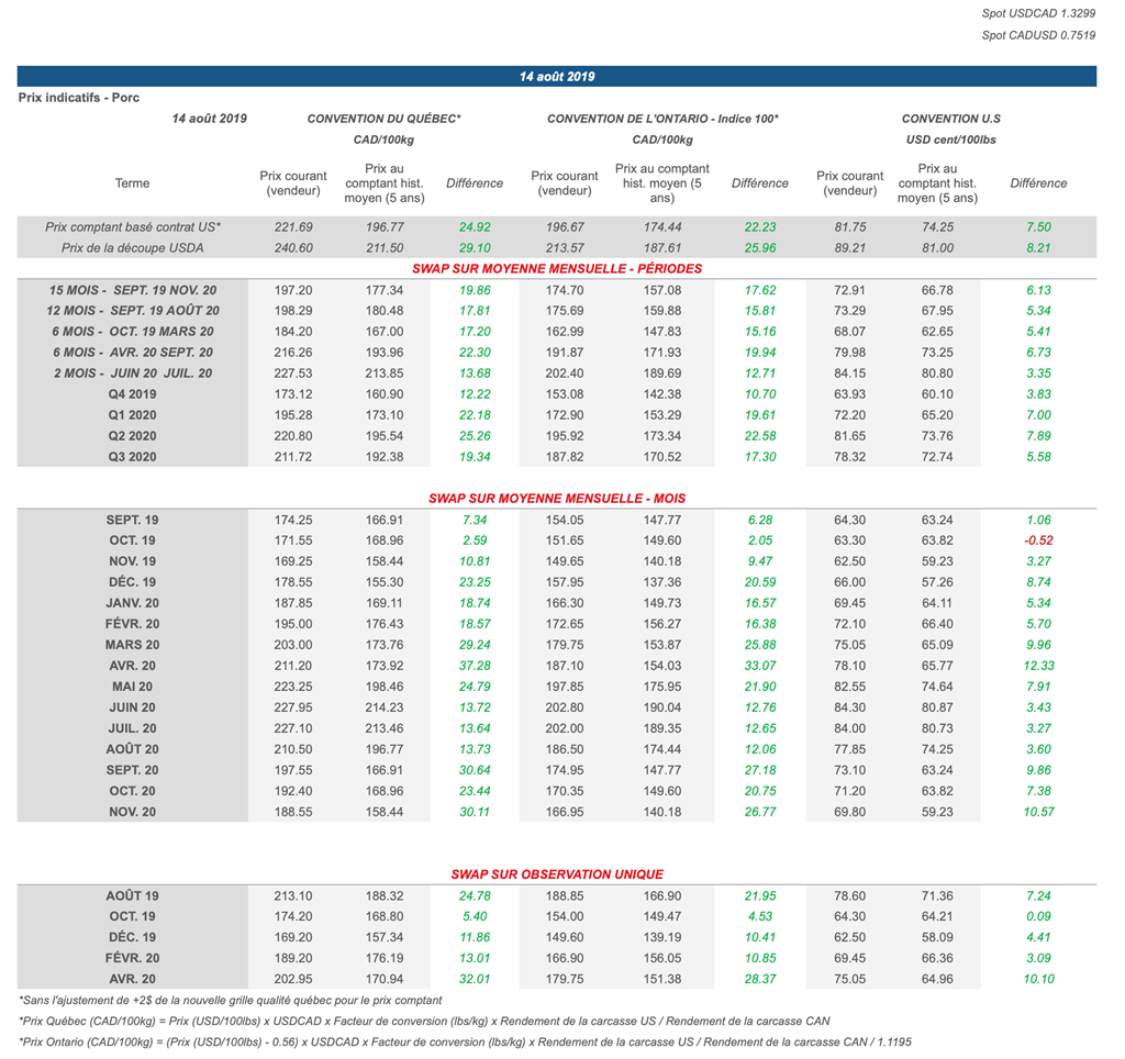 Voici les prix les plus récents sur le marché du porc et des grains: