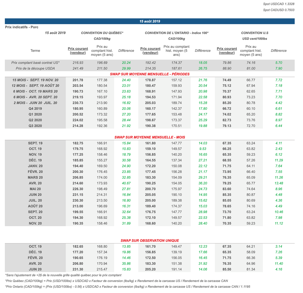 • Les contrats de porc (CME) ont enregistré des gains intéressants hier. Le contrat actif (octobre) a notamment augmenté de 3.60% hier.