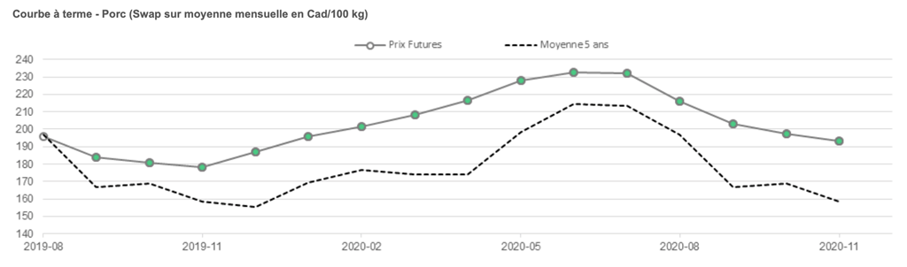 Voici les prix les plus récents sur le marché du porc et des grains: